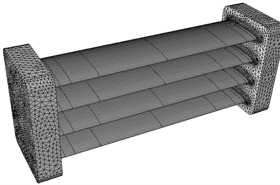 CFD of fluid flow through a heat exchanger model shows boundary layers coupled with extrusion. Clip plane view (bottom) shows unstructured mesh with boundary layers transitioning to extrusion-coupled mesh.