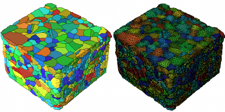 Above is a standard microstructure dataset from DREAM.3D. The left shows the model after smoothing has been applied, the right shows the mesh, generated using curvature-based refinement as well as a background mesh size.