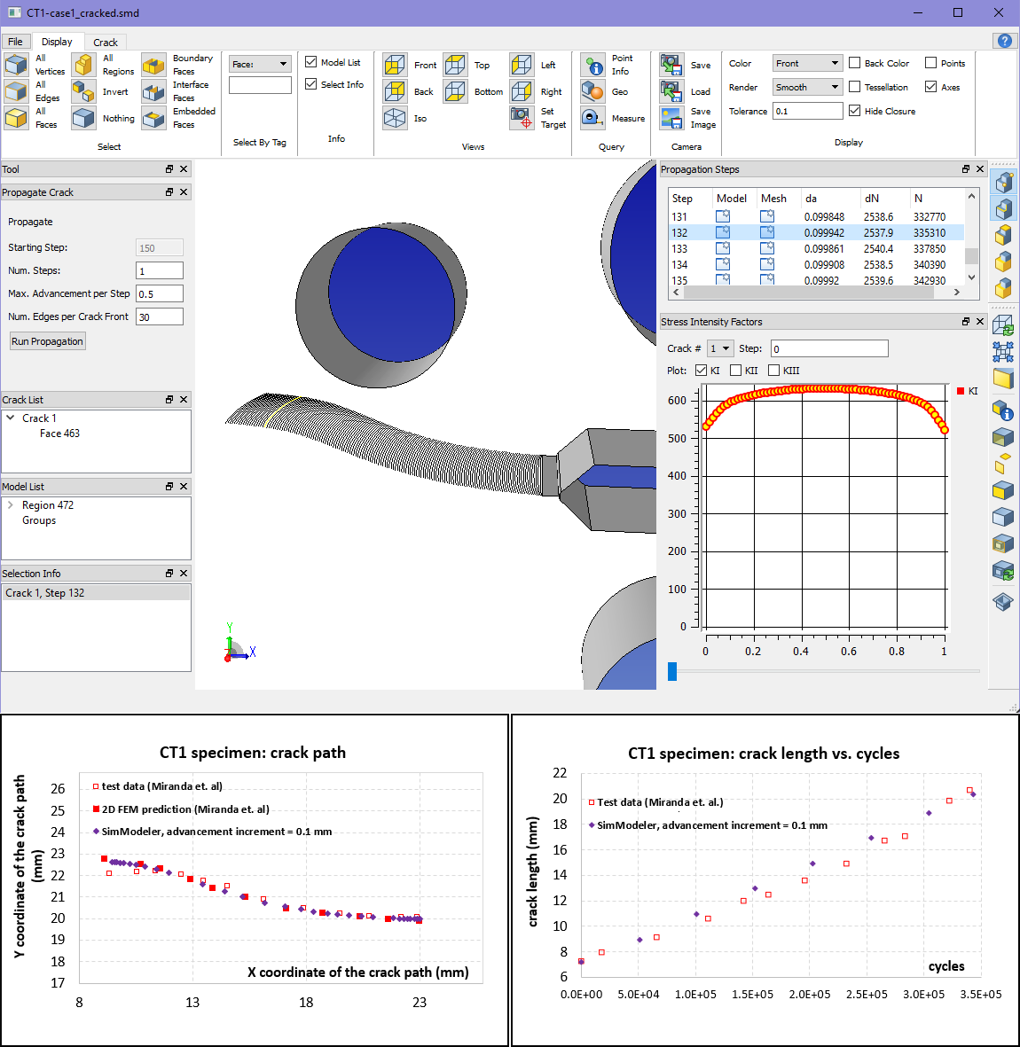 - Continuous linkage between geometric entities and meshes produced for each step in the crack propagation simulation provides a robust process to automatically assign boundary conditions and loads onto each generated model