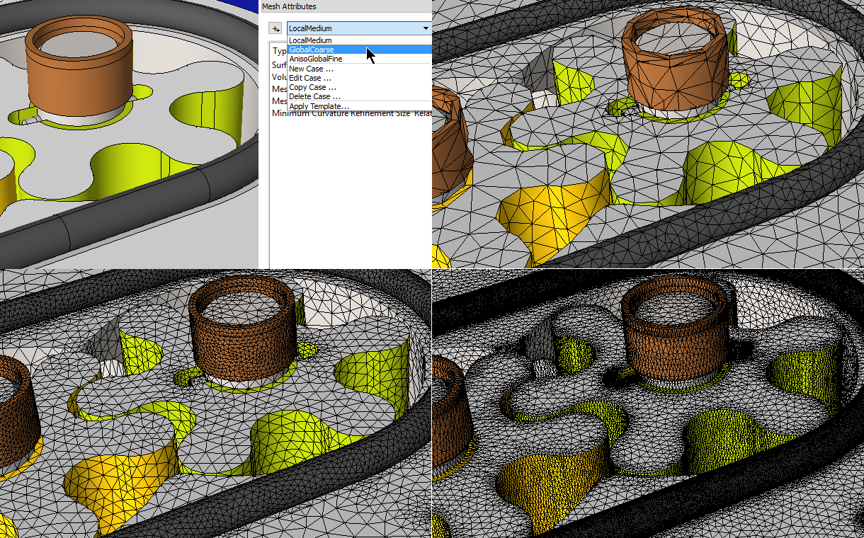 Below are examples of using different meshing cases on the same geometry. The meshing case interface allows for copying one case to another, turning on/off attributes within a case, and applying some quick templates to get the user up and running.