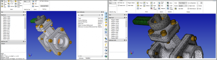 SimModeler can import CAD geometry as well as discrete geometry (STL and other mesh-based representations). SimModeler has advanced capabilities that help the user prepare the geometry for analysis. Models may be both simplified and augmented to transform the original CAD geometry into appropriate simulation geometry. Small geometric features can be eliminated to improve mesh quality. (greatly improving mesh quality).