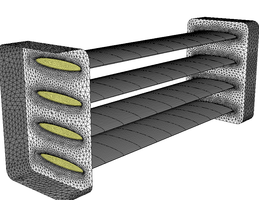 The fins of this model are individual regions that are extruded. There are boundary layers specified to capture flow through the fins. These boundary layers transition from the unstructured mesh seamlessly to the extruded mesh.